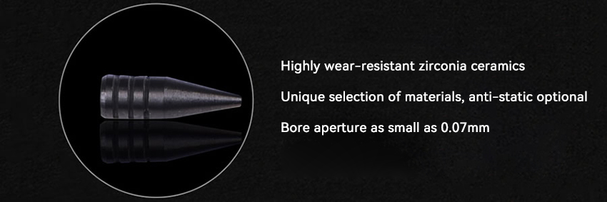 Single Nozzle Tip Zirconia Black/Silver wear resistant, ESD requiring small hole diameter, high precision