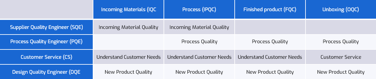 The Quality Department consists of process quality engineers, incoming material inspection, process inspection, final product inspection, unboxing inspection, design engineers, and customer service functional modules. Their respective responsibilities are as follows: